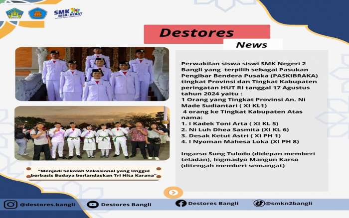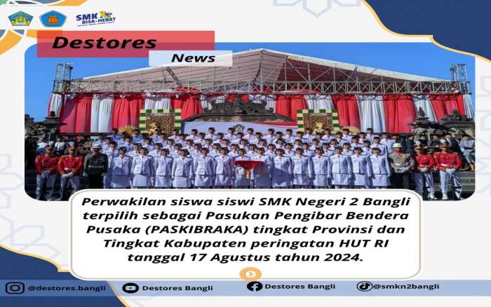 Perwakilan siswa siswi SMK Negeri 2 Bangli terpilih sebagai Pasukan Pengibar Bendera Pusaka (PASKIBRAKA) tingkat Provinsi dan Tingkat Kabupaten peringatan HUT RI tanggal 17 Agustus tahun 2024.