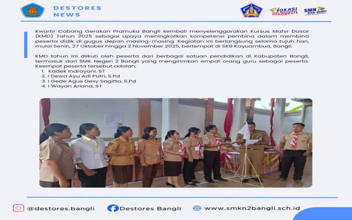 Kwartir Cabang Gerakan Pramuka Bangli kembali menyelenggarakan Kursus Mahir Dasar (KMD) Tahun 2025 sebagai upaya meningkatkan kompetensi pembina dalam membina peserta didik di gugus depan masing-masing. Kegiatan ini berlangsung selama tujuh hari, mulai Senin, 27 Oktober hingga 2 November 2025, bertempat di SKB Kayuambua, Bangli.