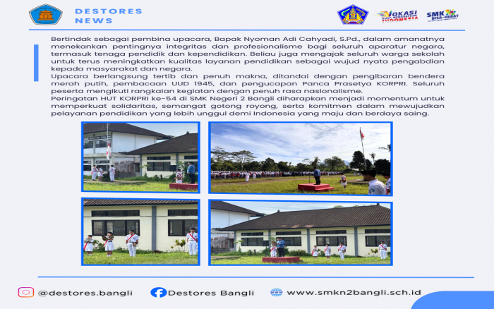 HUT KORPRI ke-54, SMK Negeri 2 Bangli Teguhkan Komitmen Mewujudkan Indonesia MajuBangli, 29 November 2025 — SMK Negeri 2 Bangli melaksanakan upacara peringatan Hari Ulang Tahun Korps Pegawai Republik Indonesia (KORPRI) ke-54 di lapangan utama sekolah. Kegiatan ini diikuti oleh seluruh warga sekolah, mulai dari guru, pegawai, hingga peserta didik, yang dengan khidmat mengikuti jalannya upacara sejak pagi hari.