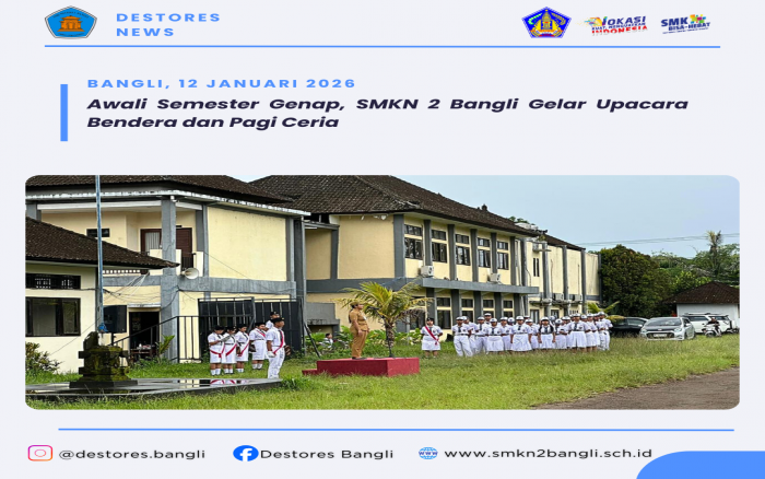 Bangli, Senin (12 Januari 2026) — SMK Negeri 2 Bangli melaksanakan Upacara Bendera pada hari pertama masuk Semester Genap Tahun Pelajaran 2025/2026. Kegiatan ini dilaksanakan di lapangan upacara sekolah dan