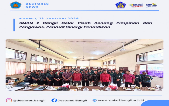 SMK Negeri 2 Bangli menyelenggarakan Acara Pisah Kenang dan Sambut Tugas pada Selasa, 13 Januari 2026, bertempat di Aula SMKN 2 Bangli, sebagai bentuk penghargaan dan ucapan terima kasih atas