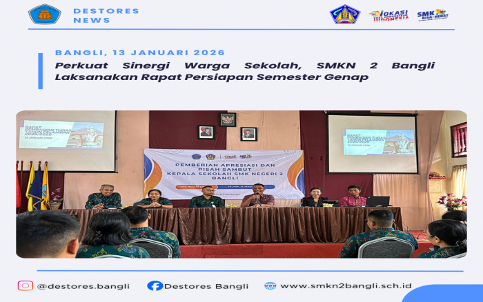 SMKN 2 Bangli menyelenggarakan Rapat Persiapan Semester Genap Tahun Pelajaran 2023/2024 sekaligus Perkenalan Pelaksana Tugas (PLT) Kepala Sekolah pada Selasa, 13 Januari 2026, bertempat di Aula SMKN 2 Bangli. Kegiatan